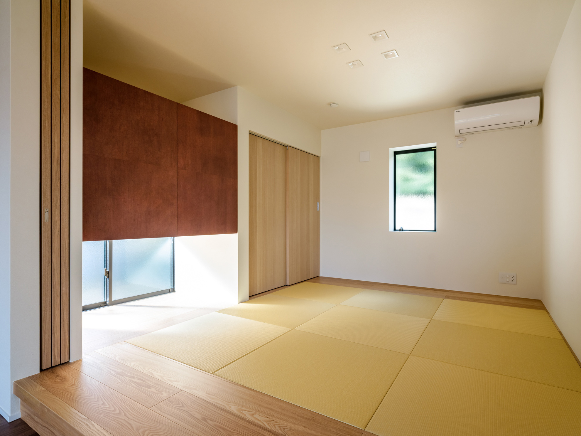 縁なし畳を使い、建具を襖ではなく木の建具とすることで、和モダンな印象の和室に仕上げています。