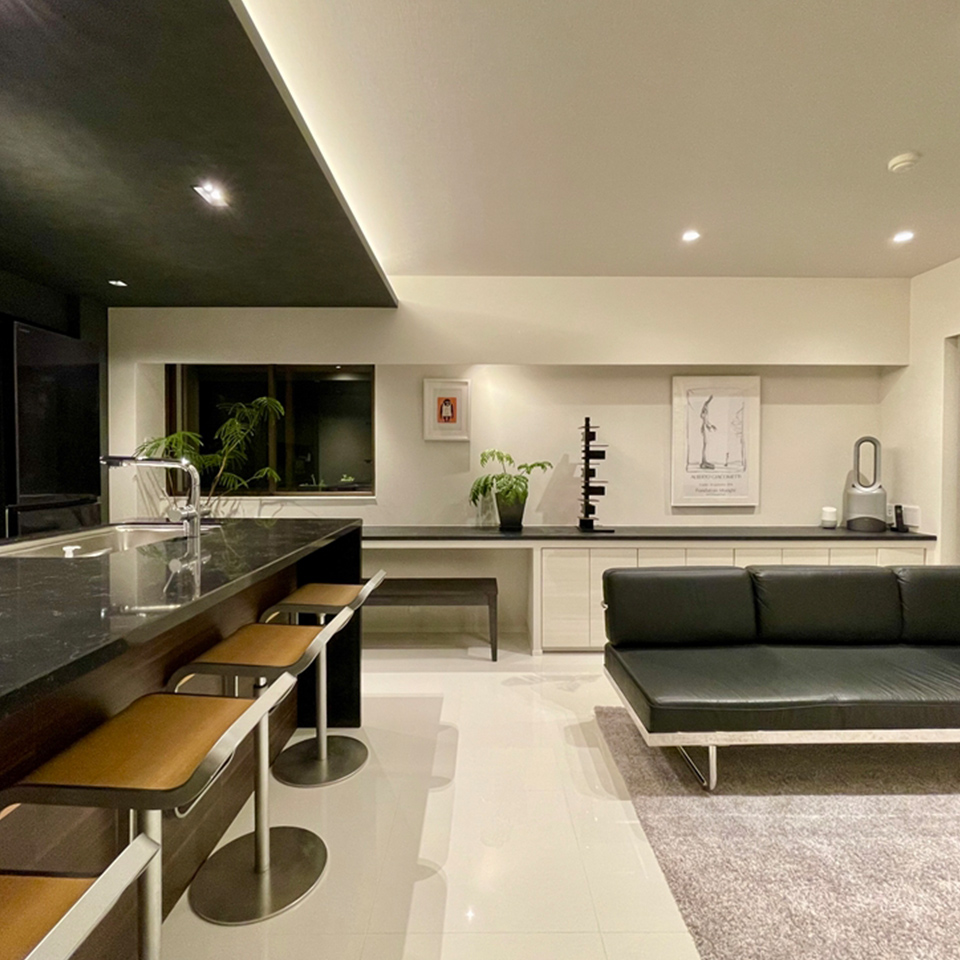 - キッチン部分の天井は高さを下げつつ色を変えて、リビングと雰囲気を切り替えています。建築化照明とすることで、空間を優しく照らします。