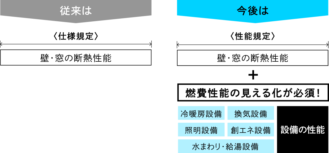 今までの仕様規定から性能規定へ判断基準が移行し、家全体の一次消費エネルギー消費量を算出し、認定基準が判断されます。2013年10月1日から改正省エネルギー基準が施行され、2020年4月にはこの基準が義務化されます。