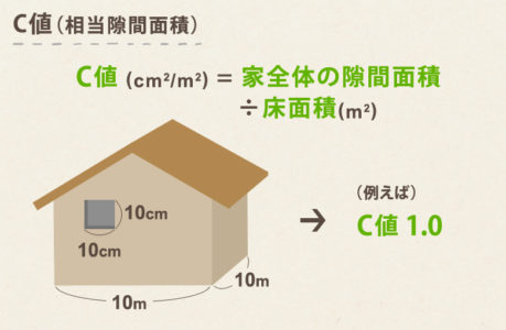 住宅の気密性能を知る上で、手がかりとなる数値が「C値」です。「C値」は相当隙間面積と呼ばれ、同じ面積の中にどれだけ隙間があるかを表した数値です。C値も数字が低いほど、気密性能が高いことを表しています。