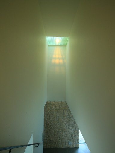 上の写真は、エントランスホール上部にあるトップライトの写真になります。写真では調光用ルーバーの上部のスポットライトが点灯していますが、照明が点灯していない状態でも、自然光により適度な明るさを感じることができます。