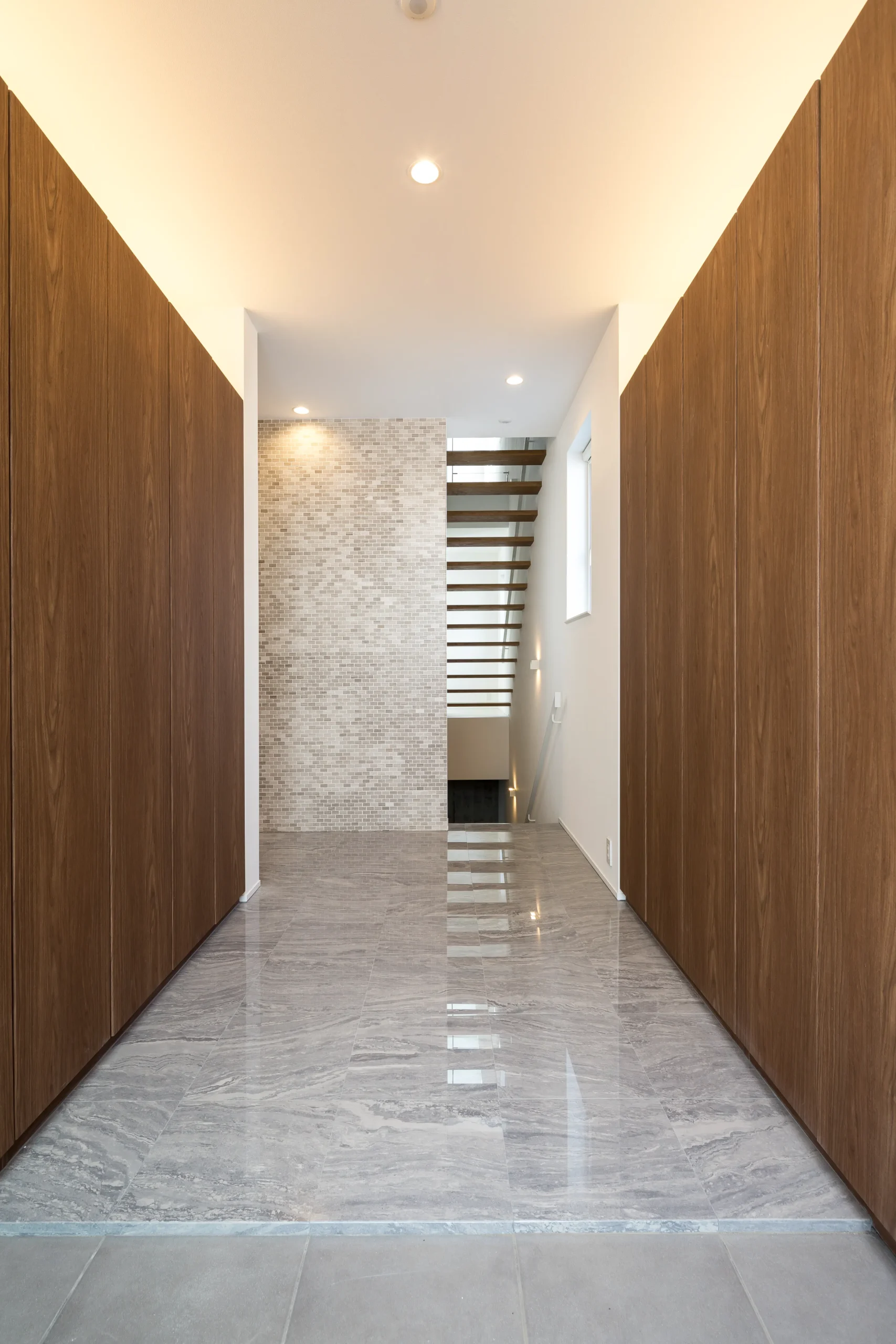 高級注文住宅の玄関においては、物理的な床面積の広さはもちろんのこと、視覚的な広がり、いわゆる「抜け感」の演出が重要になります。