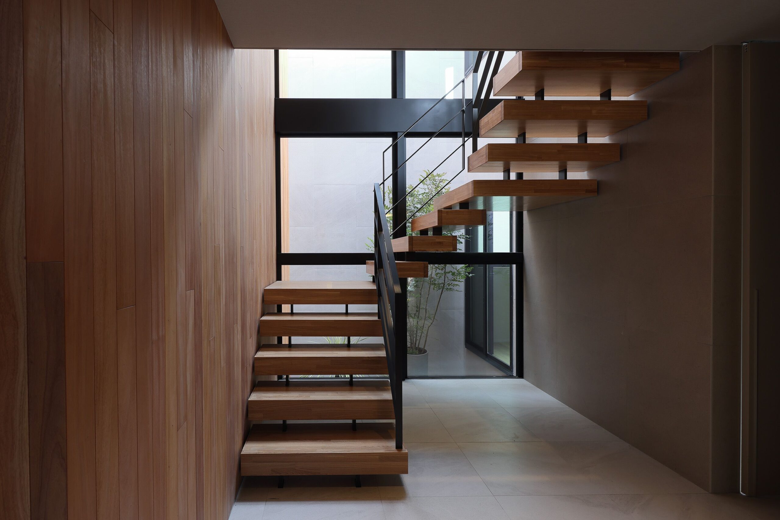 鉄骨階段をオブジェのように配置し、その隙間から中庭の緑が見えるようなプランニングも有効です。