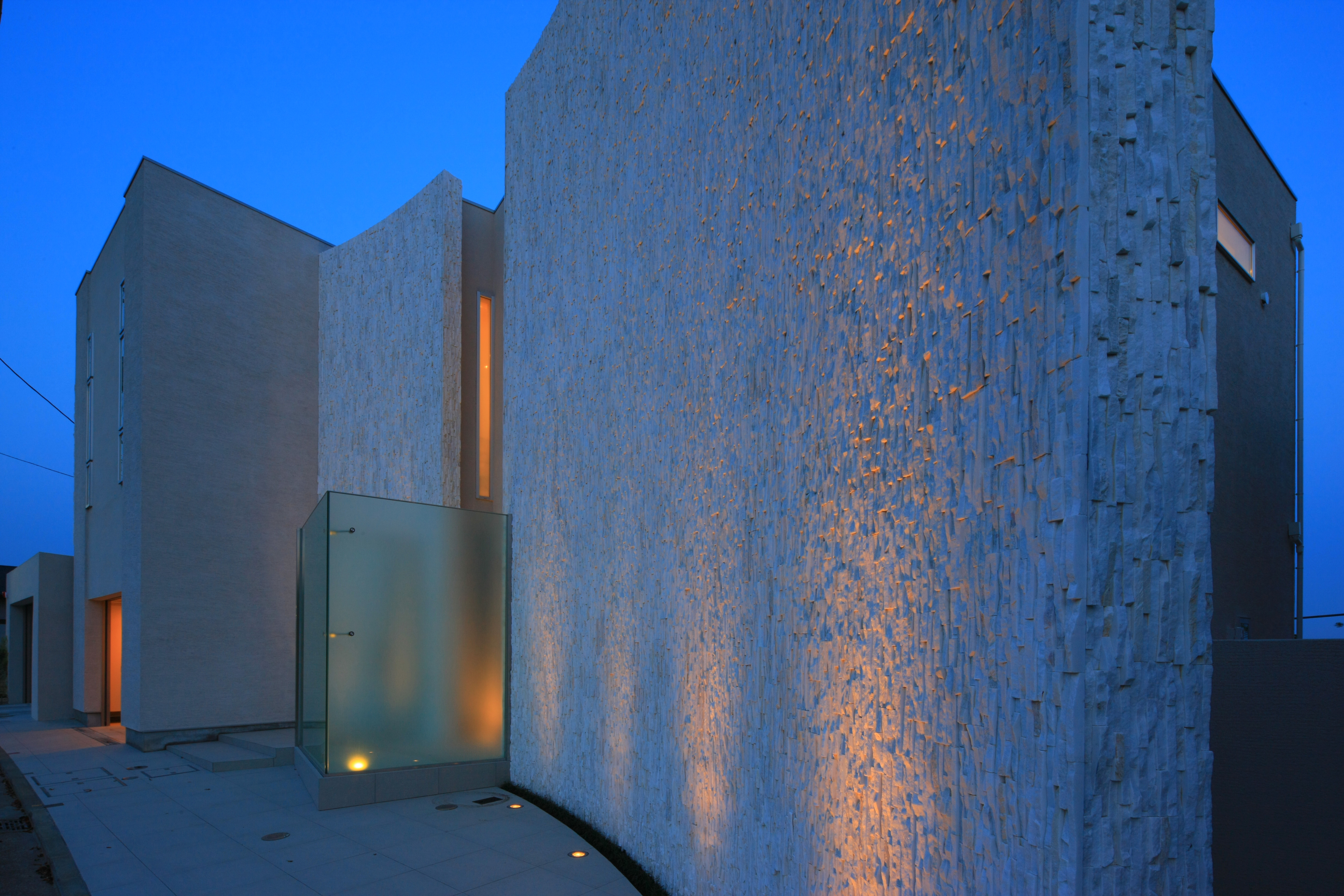 - 石のような表情のタイルやシンプルなテイストの塗り壁など、質感や色味の異なる素材が外観にメリハリを生んでいます。