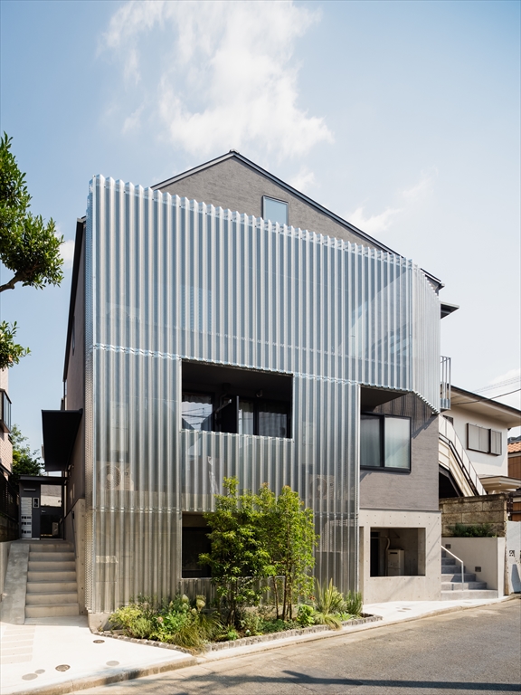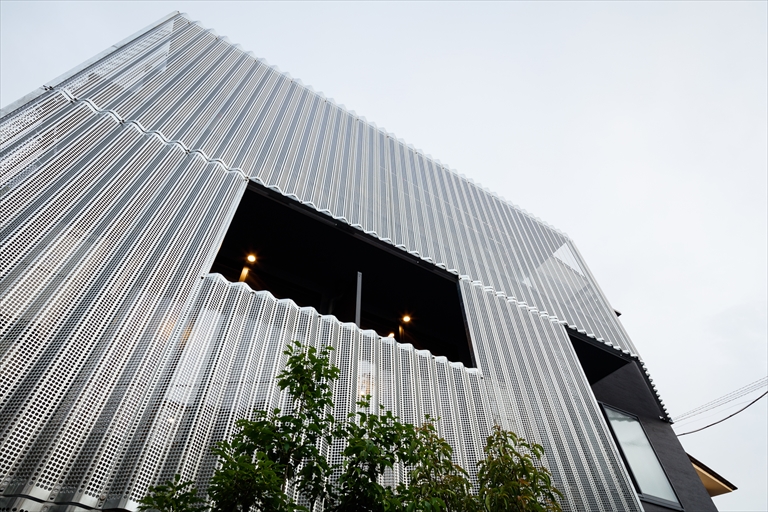 • 外観には、有孔折板(折り曲げて強度を持たせた有孔鋼板に亜鉛メッキを施したもの)を採用しています。建物の外観デザインにシャープな印象を与えると共に、前面道路からの住戸のプライバシーを確保するための目隠しとしての役割を果たしています。