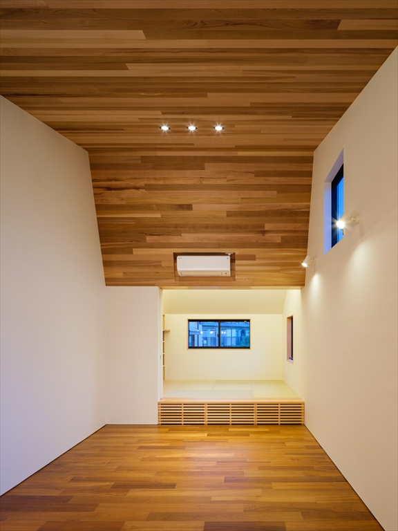 • オーナー住戸(子世帯)は2階にあることから、屋根形状を活かした勾配天井の仕上げに木を貼り、間接照明を設けるなど、内部空間に奥行きを持たせると共に部屋の雰囲気を高めています。